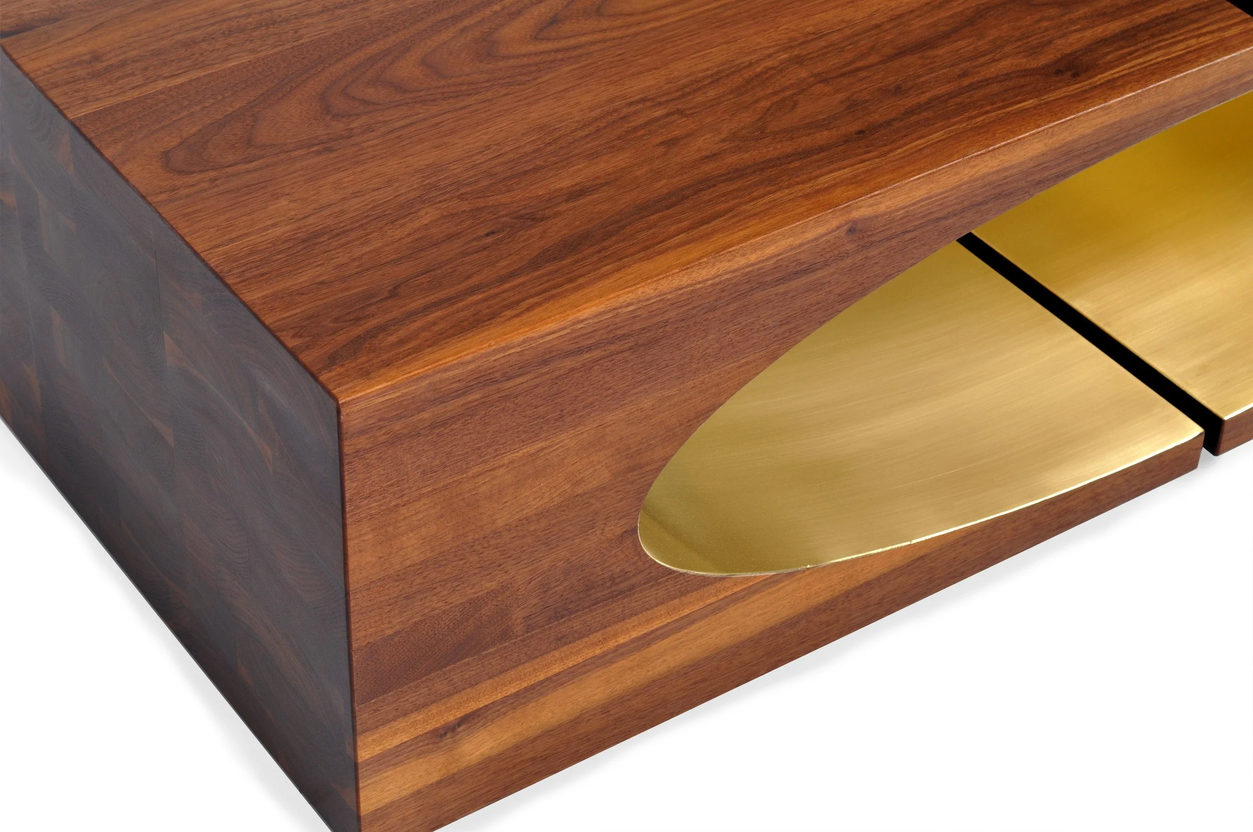 Ellipse is our tribute to the massive solid wood pieces pioneered by 1970's studio furnituremakers. Made from solid woods like Walnut and Ash, the interior is available lacquered or wrapped in brass or bronze.