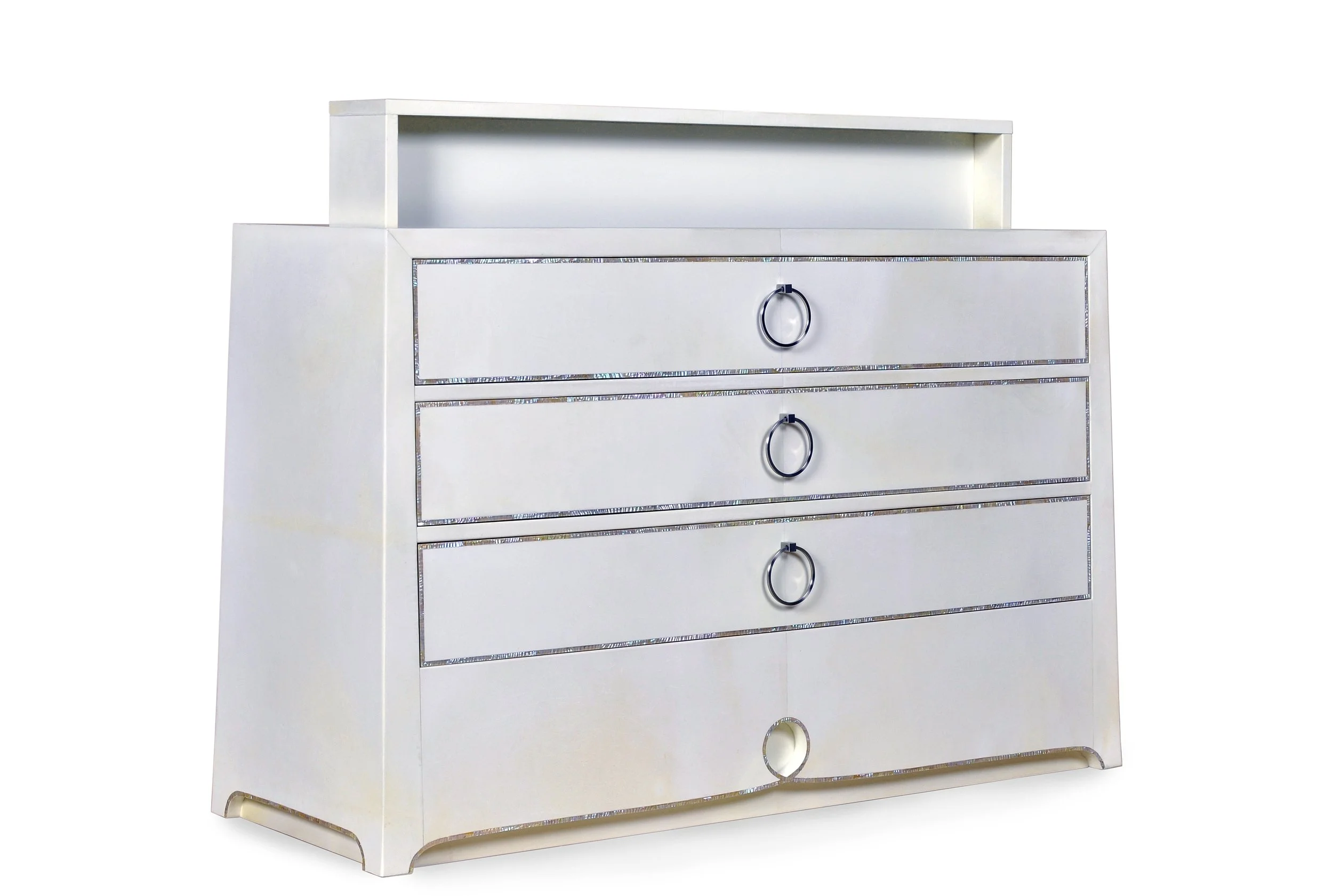 We think Lune is the love child of French Rococco and Karl Springer. Yikes. Lacquer, yes. Tapered seamless forms? Yes. Then add inlaid, polished metal, oh my. Fight the impulse. More than that though Lune is built to the highest standards with an exceptionally complex understructure and dovetailed drawers. Lune is finished with the finest modern methods and materials and at the very end is hand polished to a glassy, smooth surface.