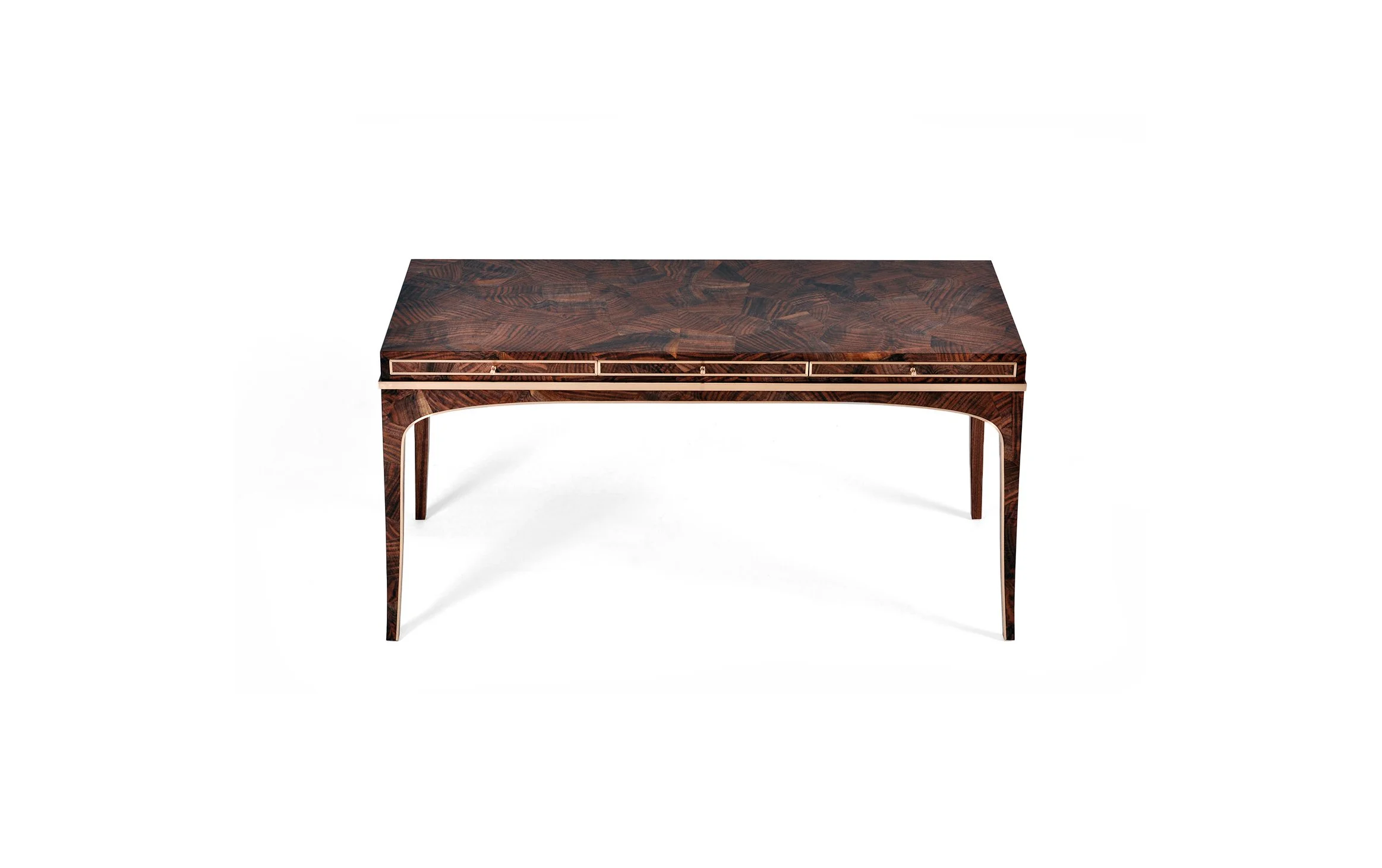 Reve is built with a marvelous solid wood understructure assembled with traditional, strong mortise and tenon joinery. Either lacquered with our ultra luxurious colors or veneered with beautiful woods, Reve holds onto its French Modernism roots and yet is totally today. The Mosaic Claro Walnut is custom designed and hand fitted into the Mosaic pattern to best display the beauty of the wood. Sparkling inlay is masterfully hand bent and set into the wood structure before being hand polished and isolated during finish in a precise and labor intensive process.